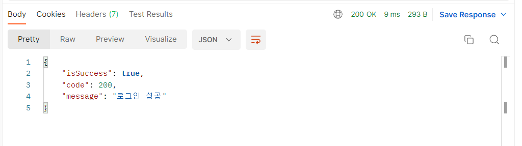 위처럼 JSON으로 값을 전송한 후에 응답 바디를 보면