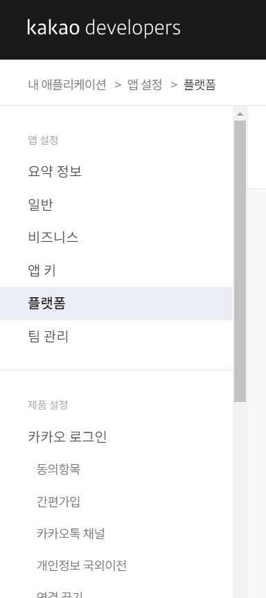 해당 애플리케이션을 클릭하여 좌측 네비게이션 바에 있는 플랫폼을 클릭합니다. 그 이후 가장 하단에 있는 Web 플랫폼 등록을 클릭합니다.