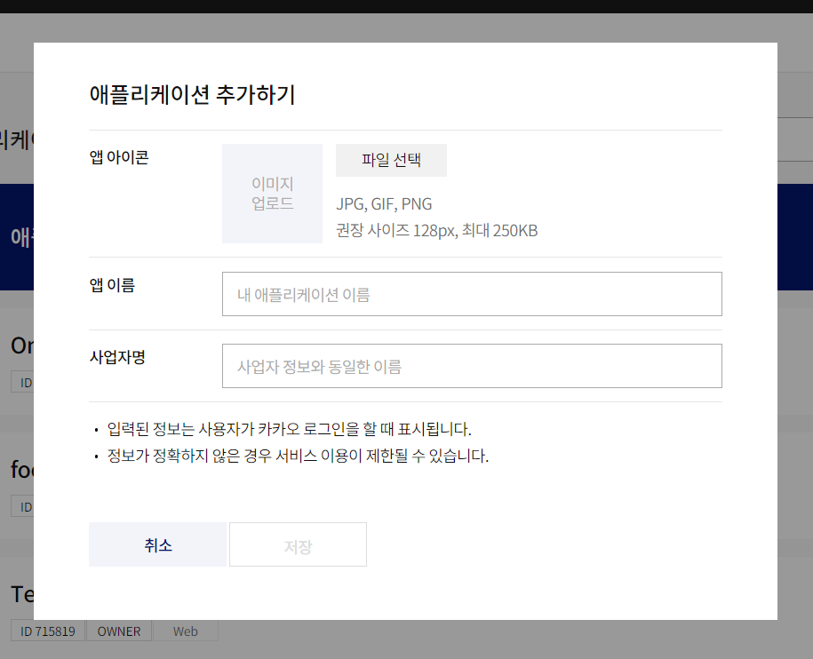앱 이름과 사업자명을 원하는 대로 적고 애플리케이션을 만듭니다.