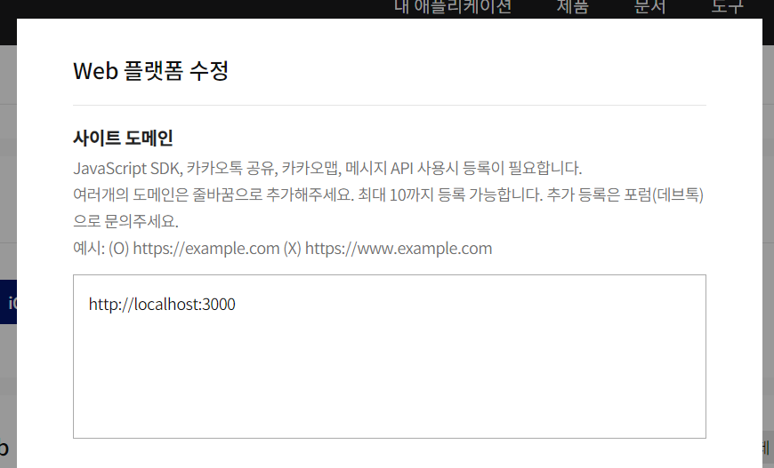 사이트 도메인에서는 로컬호스트와 익스프레스의 포트를 적습니다.