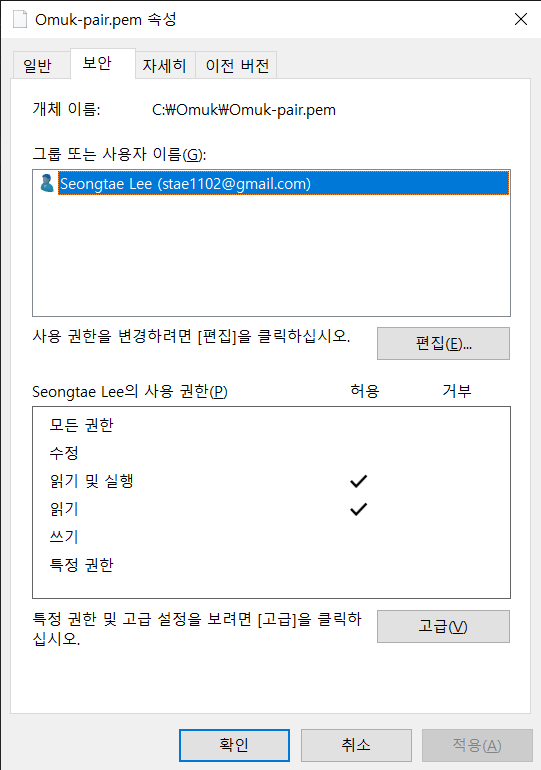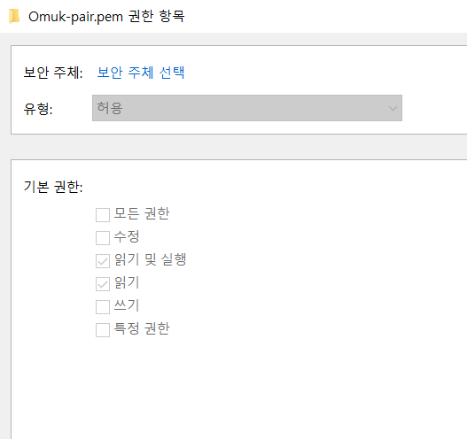 확인을 누르고, 기본 권한은 읽기 및 실행, 읽기 이 두 개만 지정해줍니다.