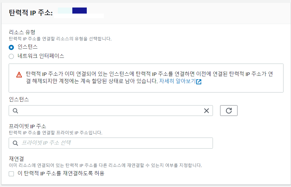 우측 상단 탄력적 IP 주소 할당을 눌러서 기본 세팅대로 할당을 받습니다. 만든 후에는 해당 아이피 주소를 눌러서 작업에 있는 탄력적 IP 주소 연결을 눌러줍니다.