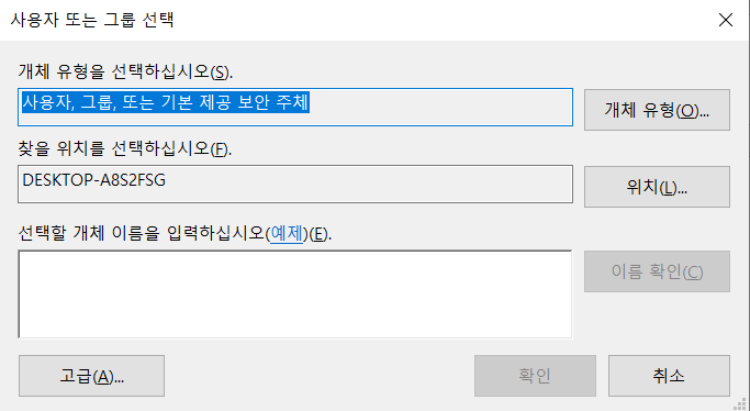 개체 이름은 현재 사용하고 있는 윈도우 계정 이름을 적어주고, 이름 확인을 눌러줍니다.