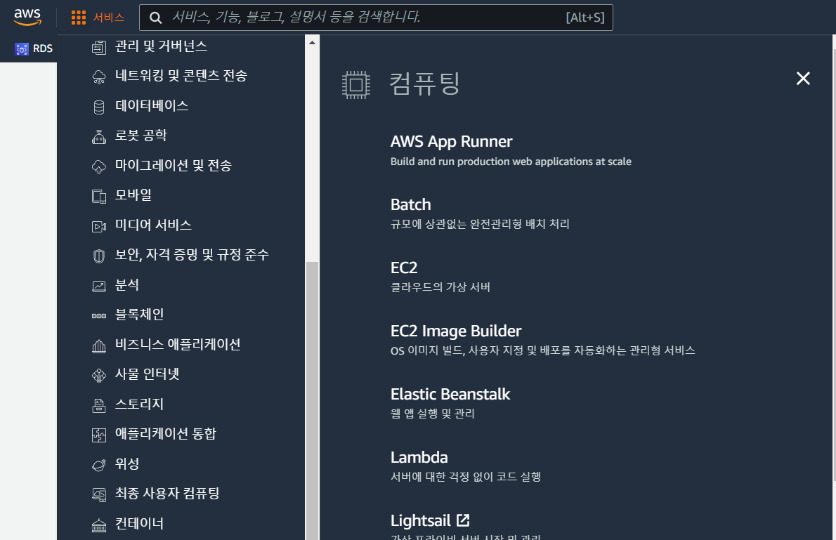 AWS에 로그인한 후에 서비스-컴퓨팅-EC2로 접근합니다.